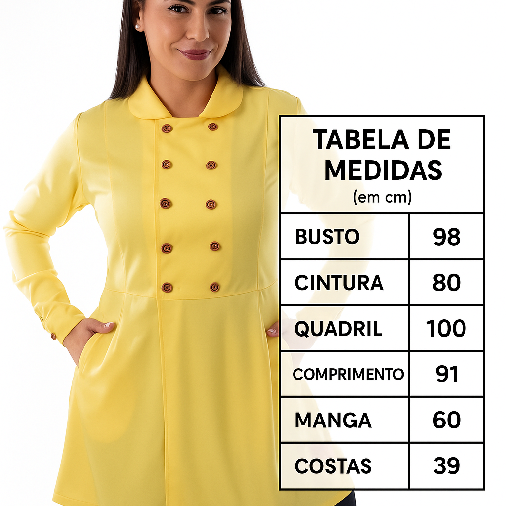 Fechamento frontal com botões duplos: Estilo alfaiataria, com botões amadeirados que dão um toque sofisticado.